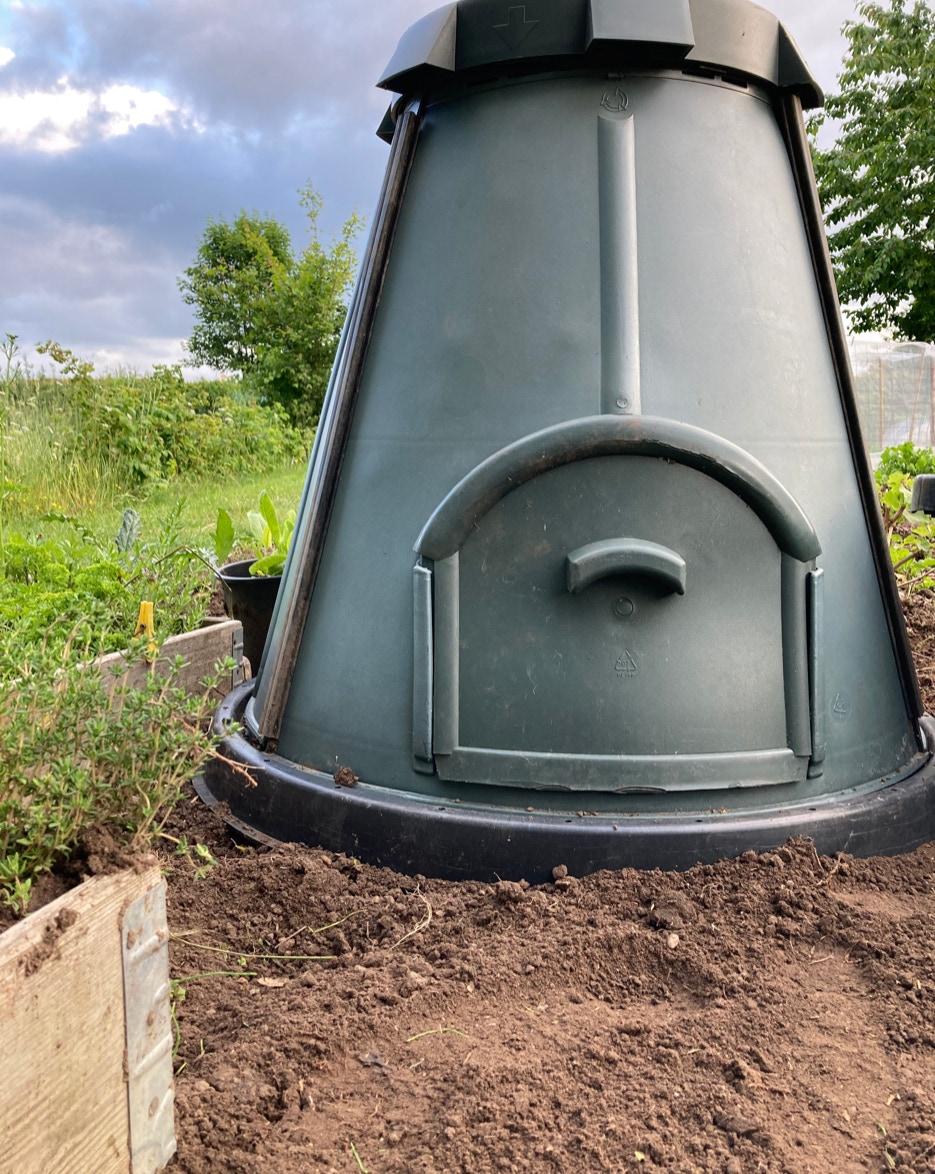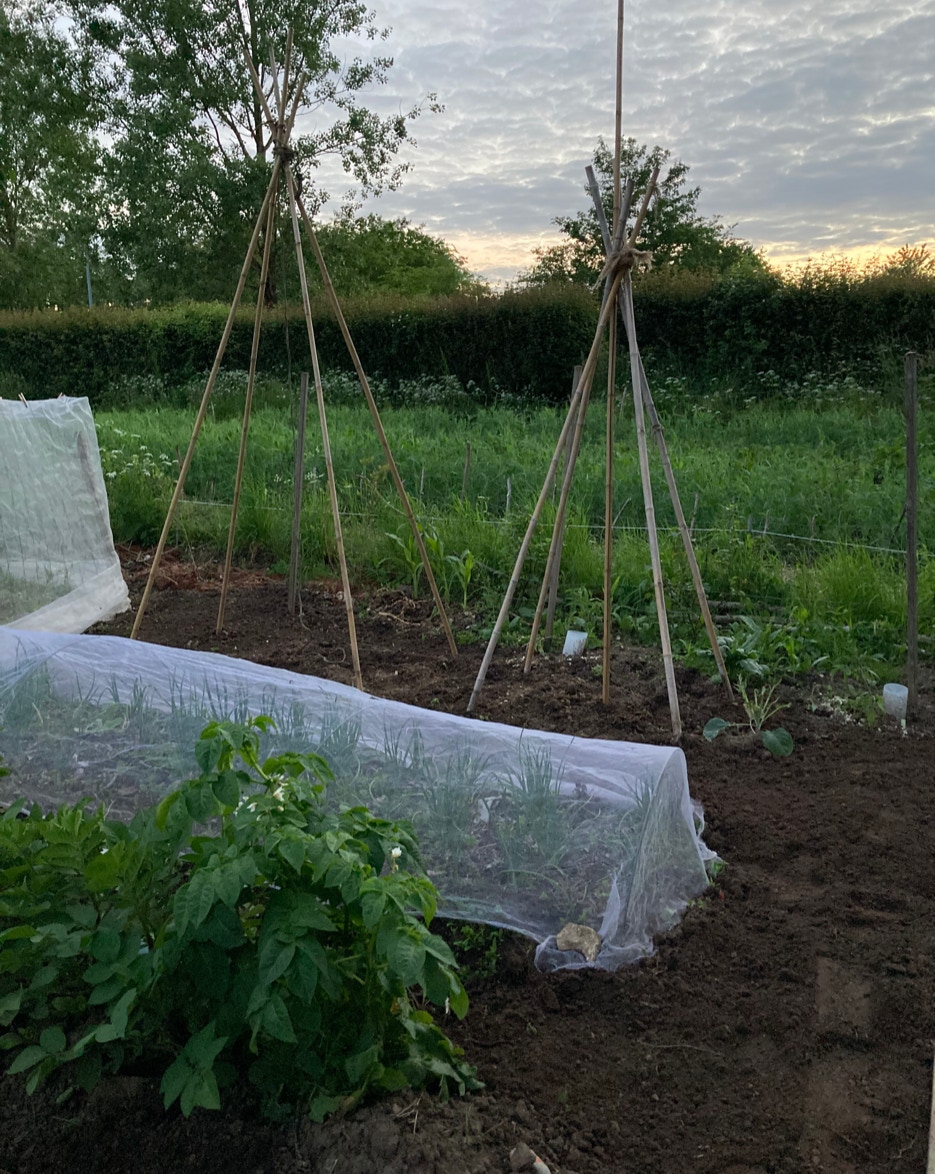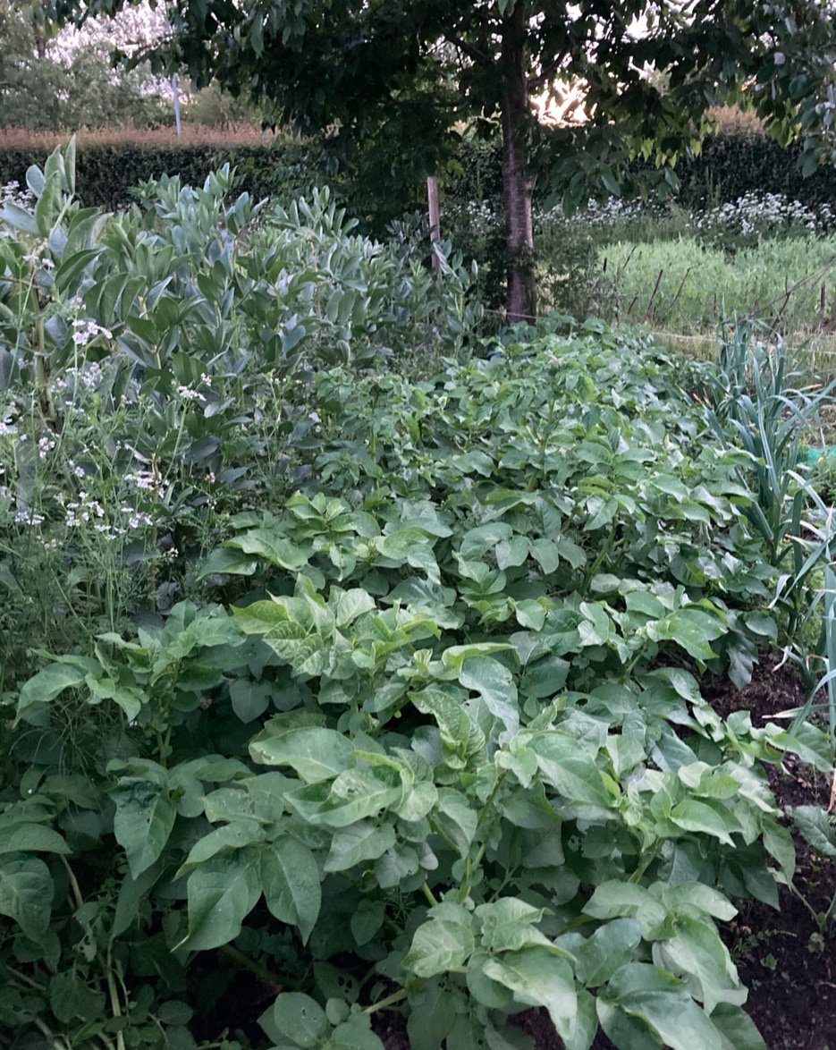 Bønnetårne med kartofler og skalotteløg i forgrunden