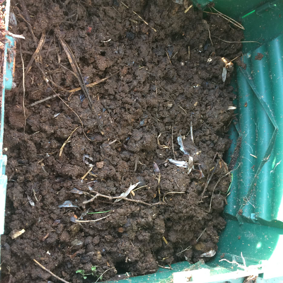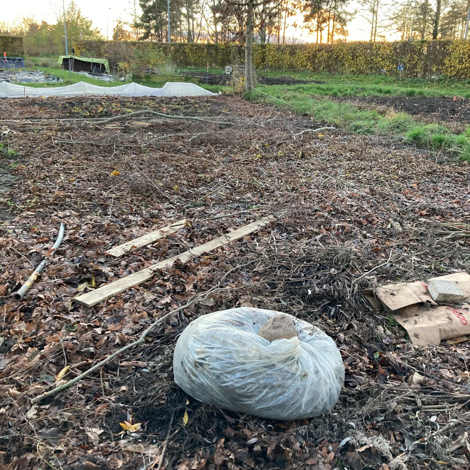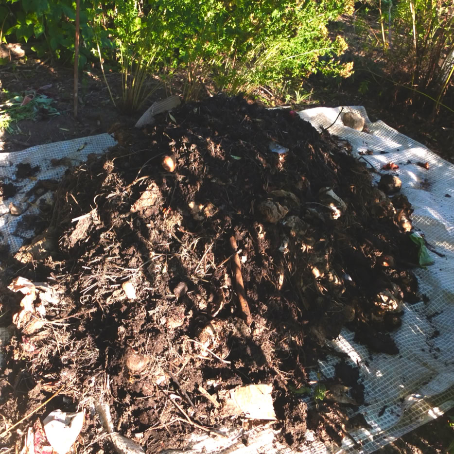 Kompost vendt ud - halvt omsat masse lægges ud på højbedene