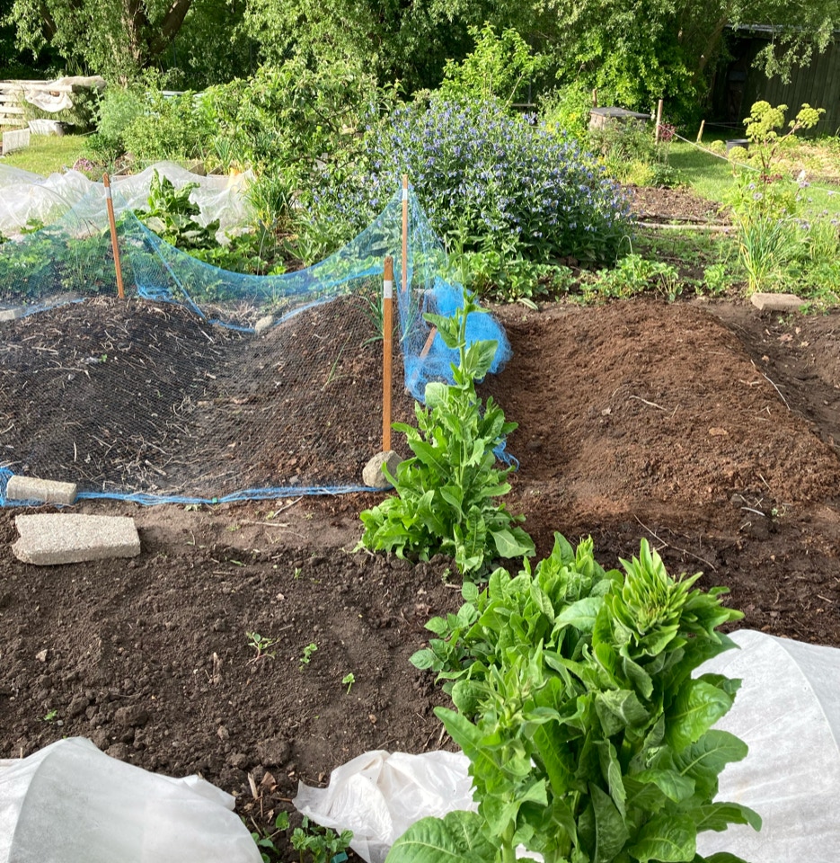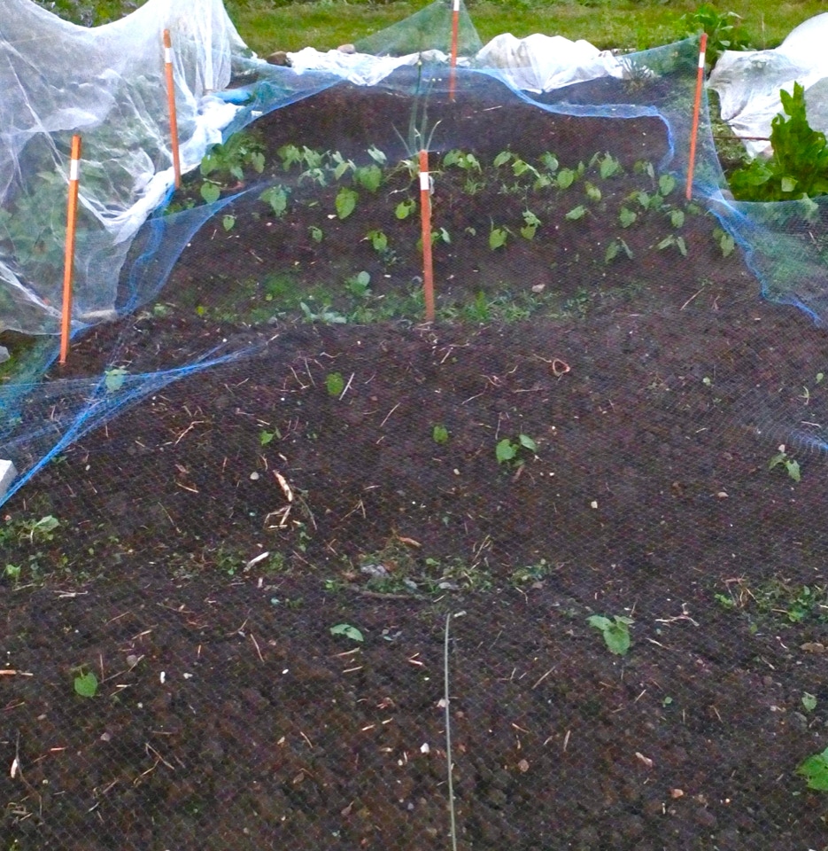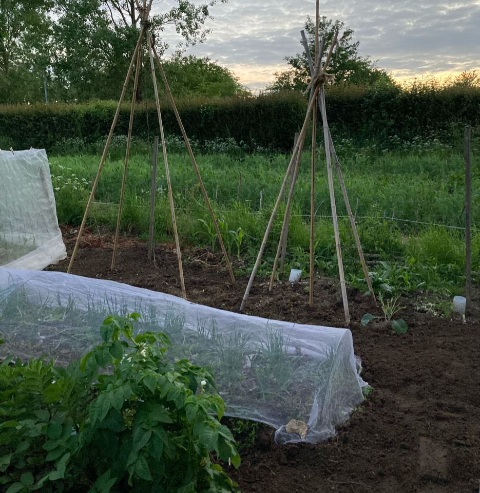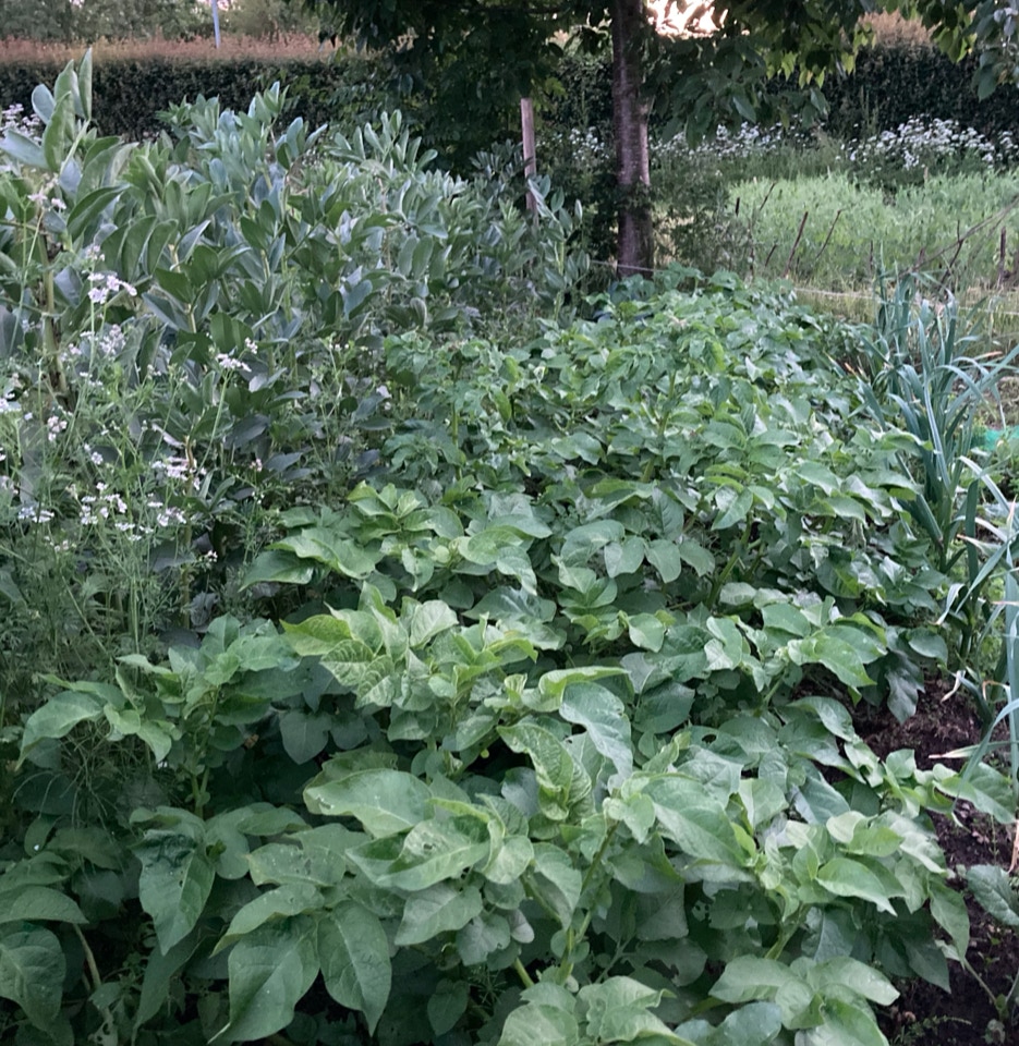 Bønnetårne og kartofler og skalotteløg i forgrunden