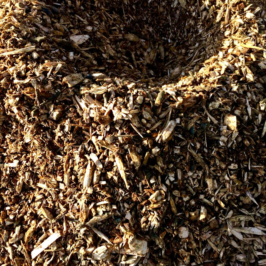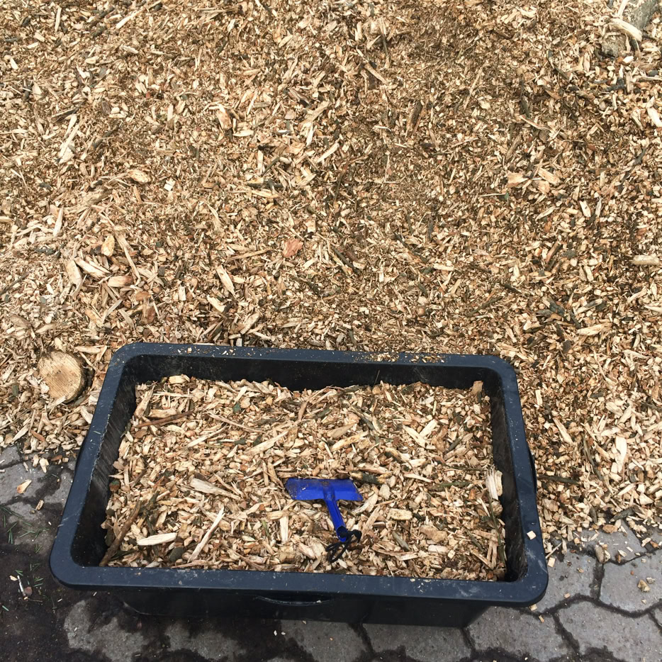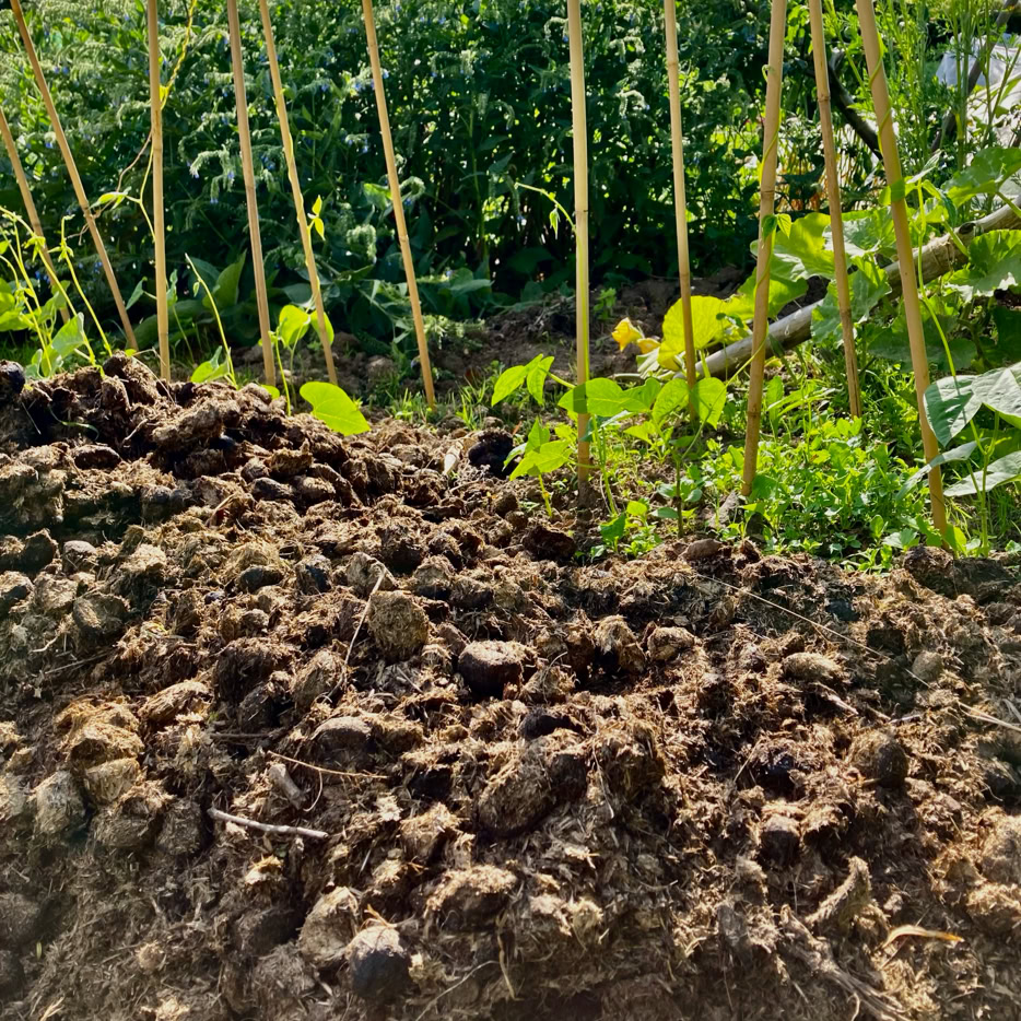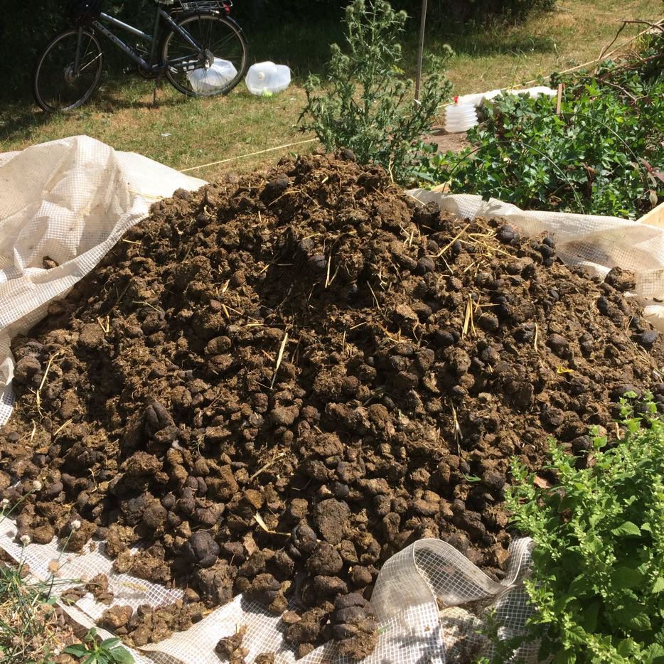 Kompost vendt ud - halvt omsat masse lægges ud på højbedene